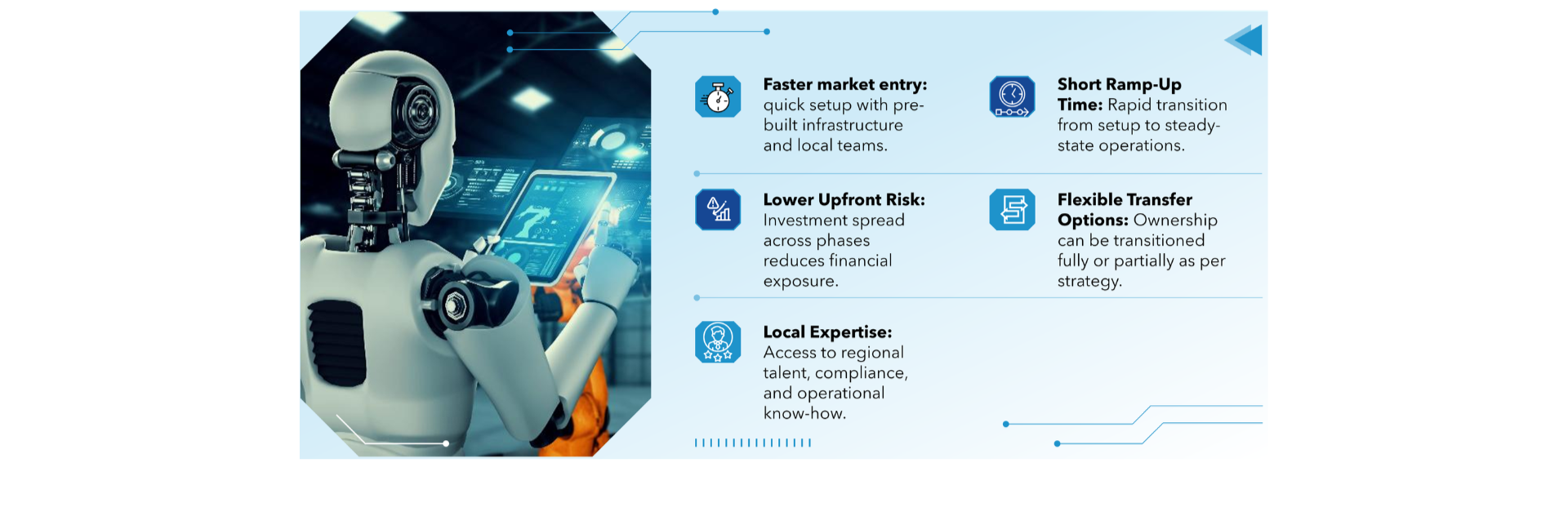 The Build Operate Transfer (BOT) model is suited for organizations that want to create their own captive engineering team, but prefer a structured, lower-risk path to get there. TAAL Tech builds the team, sets up the operating framework, and runs the operation for an agreed period, ensuring delivery stability and process maturity. Once the capability reaches defined performance and readiness milestones, the operation can be transferred to the customer as a fully functioning captive unit.